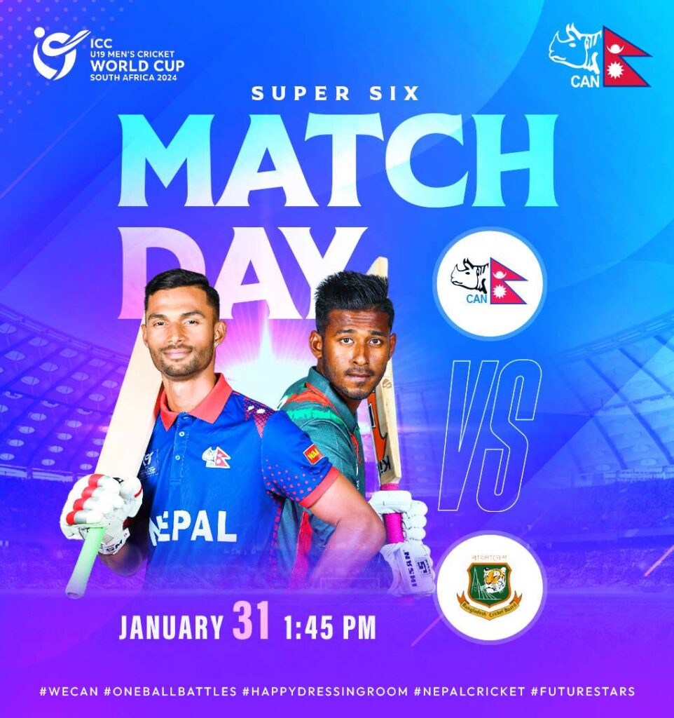 काठमाडौं । दक्षिण अफ्रिकामा जारी आईसीसी यू–१९ विश्वकपअन्तर्गत आज नेपालले बंगलादेशसँग खेल्दैछ । खेल नेपाली समयअनुसार दिउँसो १:४५ बजे हुनेछ ।