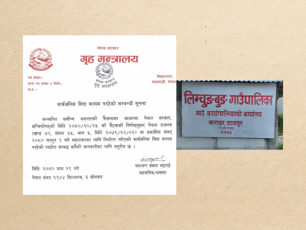 ‘सर्वोच्च अदालतको फैसलाका आधारमा नेपाल मन्त्रिपरिषदको मिति २०८०–१०–२५ को बैठकको निर्णयानुसार नेपाल राजपत्र (खण्ड ७२, संख्या ६५, भाग ५ मिति २०७९–१२–०२) मा प्रकाशित २०८० फागुन १ गते मंगलबारका लागि निर्धारण गरिएको सावजनिक बिदा कायम नरहेको व्यहोरा सम्बद्ध सबैको जानकारीका लागि अनुरोध छ’ गृह मन्त्रालयका प्रवक्ता नारायणप्रसाद भट्टराईले जारी गरेको विज्ञप्तिमा भनिएको छ ।