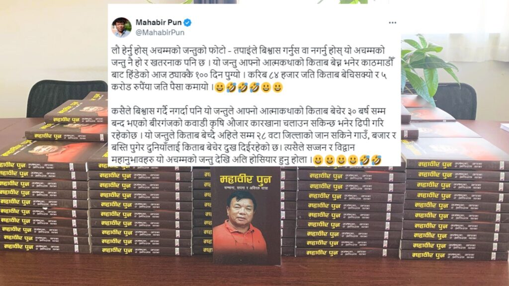 काठमाडौं । राष्ट्रिय आविष्कार केन्द्रका अध्यक्ष महावीर पुनले आत्मकथा बेचेर पाँच करोड रुपैयाँ आर्जन गरेको बताएका छन् । गत असोज २८ मा सार्वजनिक भएको ‘महावीर पुन सम्झना, सपना र अविरल यात्रा’ नामक पुस्तक लिएर विभिन्न जिल्लामा बिक्रीका लागि पुगेका पुनले पछिल्लो १०० दिनमा ८४ हजार प्रति पुस्तक बिक्री भएको जानकारी गराएका छन् ।