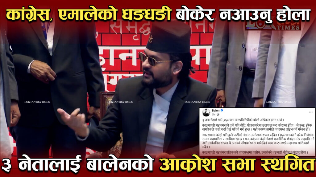 काठमाडौं । काठमाडौं महानगरका प्रमुख बालेन शाहले नेपाली कांग्रेस र नेकपा एमालेका वडाध्यक्षहरुलाई पार्टीको धङ्धङ्गी बोकेर नगरसभामा नआउन चेतावनी दिएका छन् । आज तय भएको नगरसभा कांग्रेस र एमालेका वडाध्यक्षहरुले बहिस्कारका कारण स्थगित भएपछि मेयर बालेनले सामाजिक सञ्जाल मार्फत आक्रोश पोखेका हुन् ।