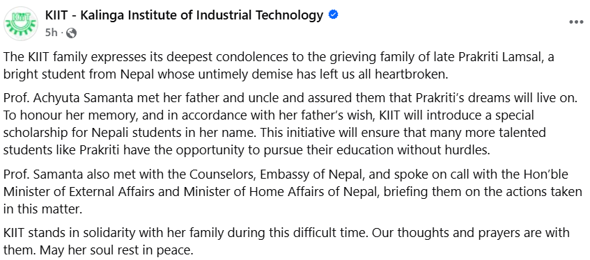 काठमाडौं । भारतको ओडिसा राज्यस्थित कालिङ्गा इन्स्टिच्युट अफ इन्डस्ट्रियल टेक्नोलोजी(केआइआइटी)ले प्रकृति लम्सालको सम्मान र संस्मरणमा नेपाली विद्यार्थीलाई विशेष छात्रवृत्ति प्रदान गर्ने भएको छ।