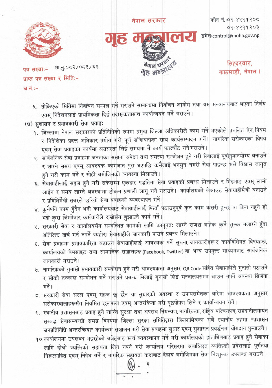 ७ पेज लामो ११ फरक विषयहरुमा मन्त्रालयले दिएको निर्देशनमा निर्वाचन सुरक्षाका विषयहरु पनि औंल्याइएको छ । जहाँ २१ फागुनमा हुने प्रतिनिधि सभा चुनावका लागि सबै सरोकारवालहरुसँगको समन्वयमा जिल्लास्तरमा निर्वाचनमैत्री वातारण बनाउँदै लैजानुपर्ने उल्लेख गरिएको छ ।