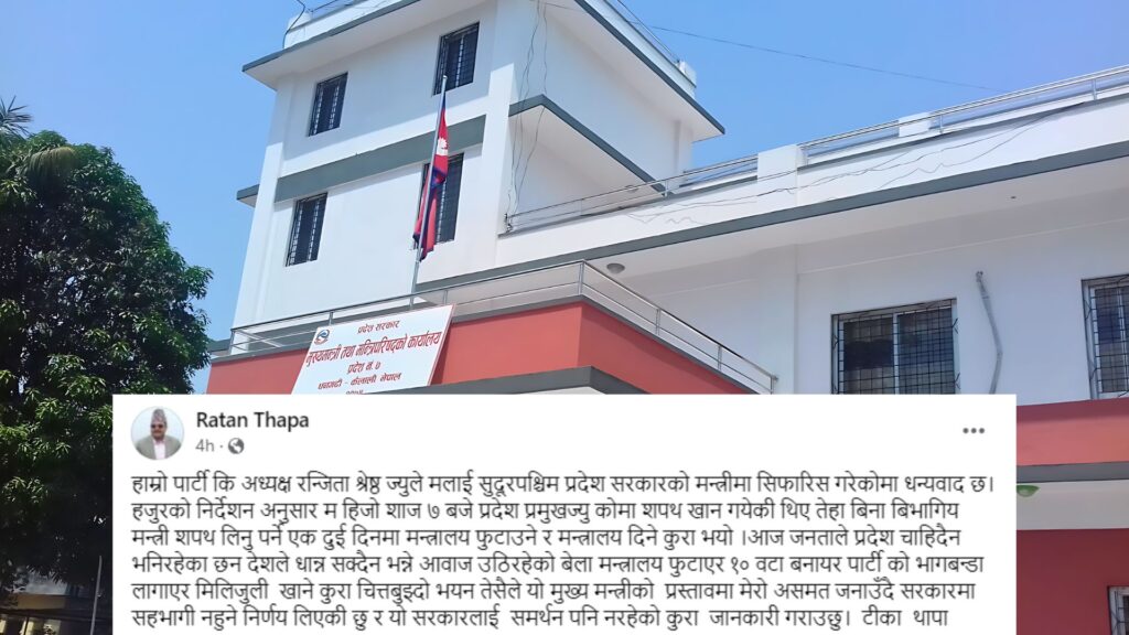 काठमाडौं । सुदूपश्चिम प्रदेशको मुख्यमन्त्रीमा नियुक्त भएका नेकपा एकिकृत समाजवादी प्रदेश संसदीय दलका नेता दीर्घबहादुर सोडारी सपथ लिएकै भोलिपल्ट अल्पमतमा परेका छन् । नागरिक उन्मुक्ति पार्टीको रञ्जिता श्रेष्ठ खेमाका एक जना प्रदेश सभा सदस्यले समर्थन फिर्ता लिएको घोषणा गरेपछि सोडारी अल्पमतमा परेका हुन् । मन्त्री पदको सपथका लागि प्रदेश प्रमुखको कार्यालय बोलाएको तर बिना विभागीय […]